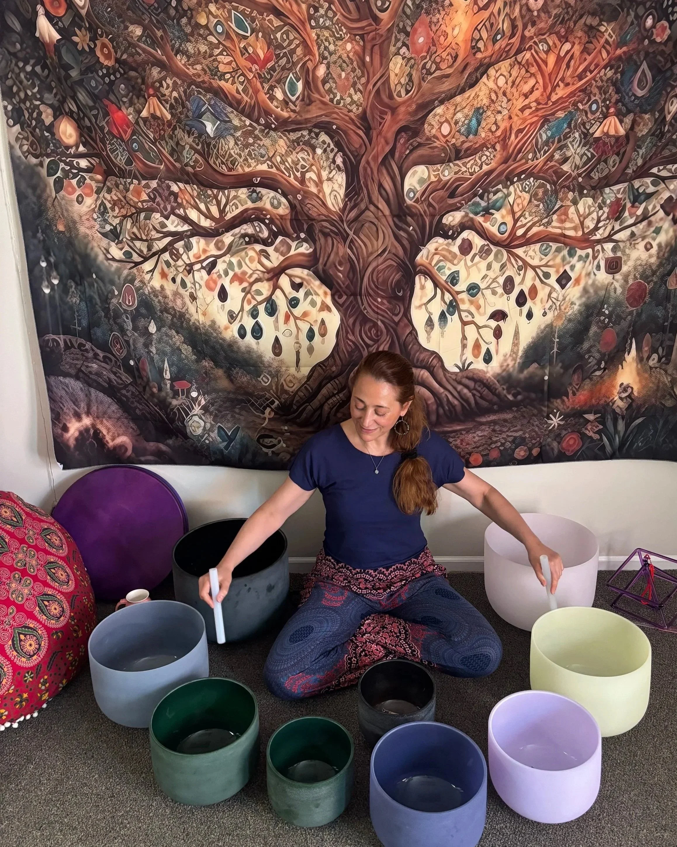 We begin with some breathing to slow down, focus and relax. Then we move into a brief, guided meditation to help provide focus for healing and to direct the healing energy of the singing bowls. Solfeggio crystal sound bowls infused with gemstones (like amethyst, lapis and obsidian) are then played to provide sonic healing and to deepen the meditation. Click here for more information about Solfeggio frequencies or go to Sound Healing for more information about Sound Healing